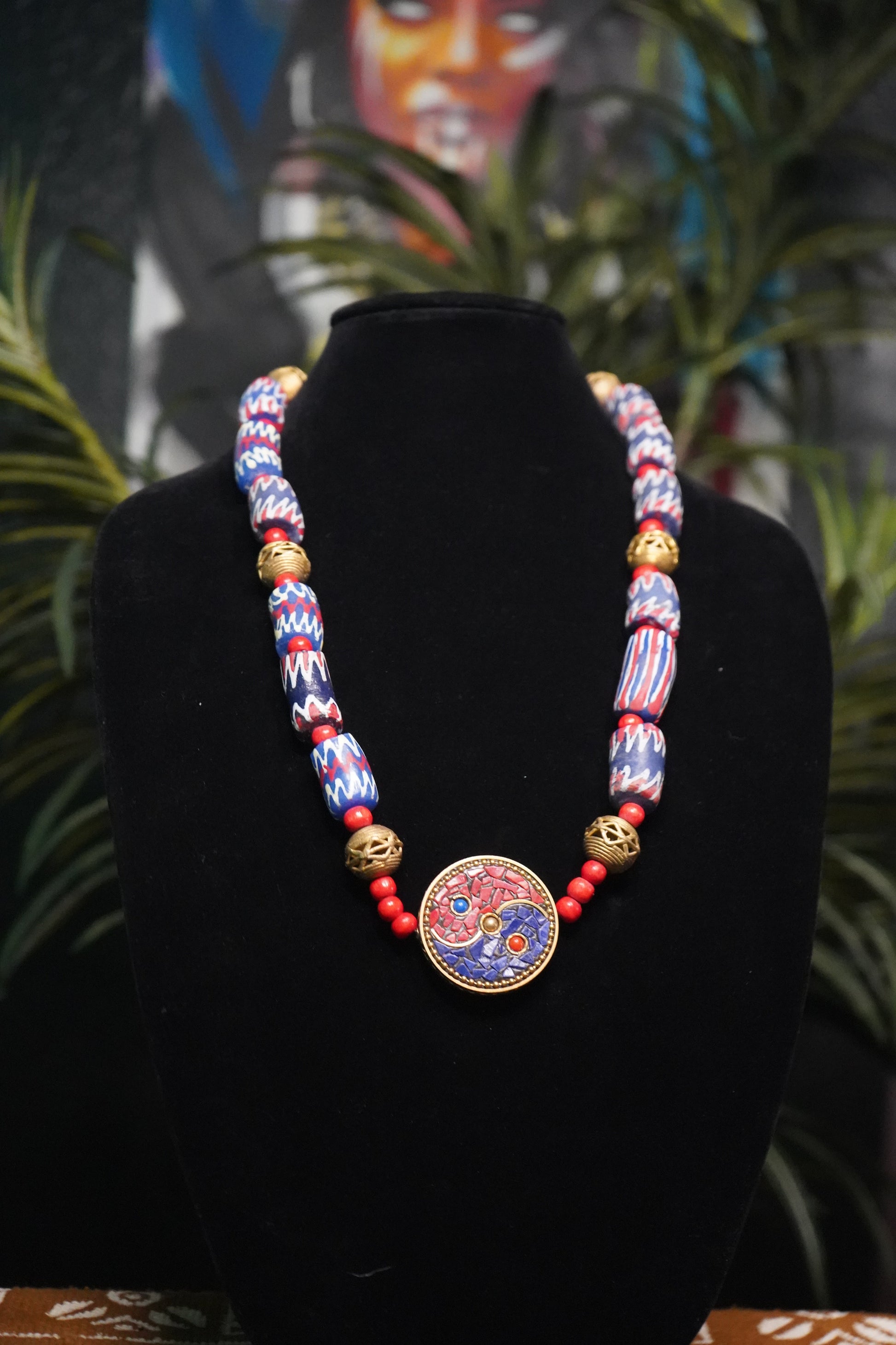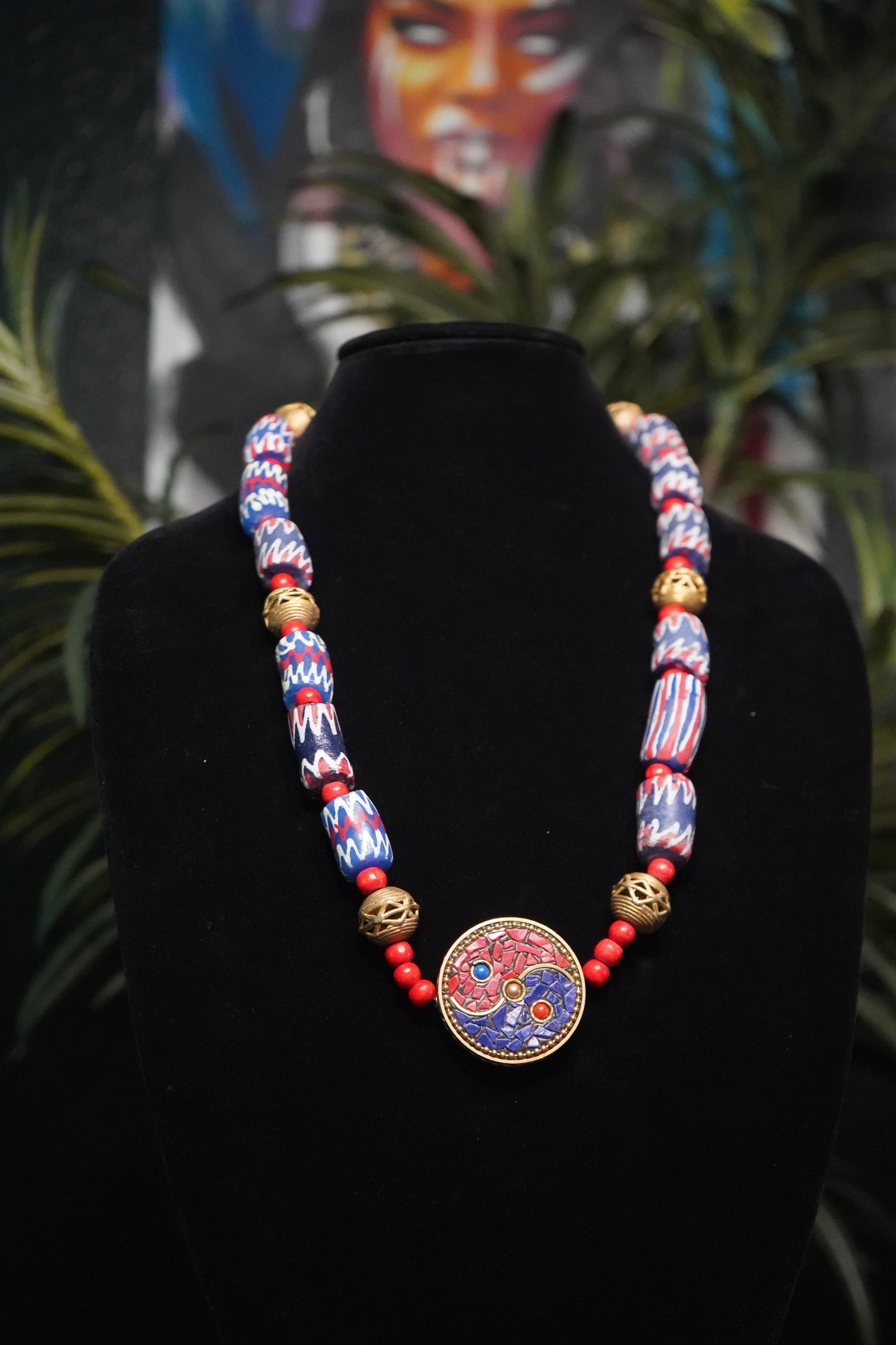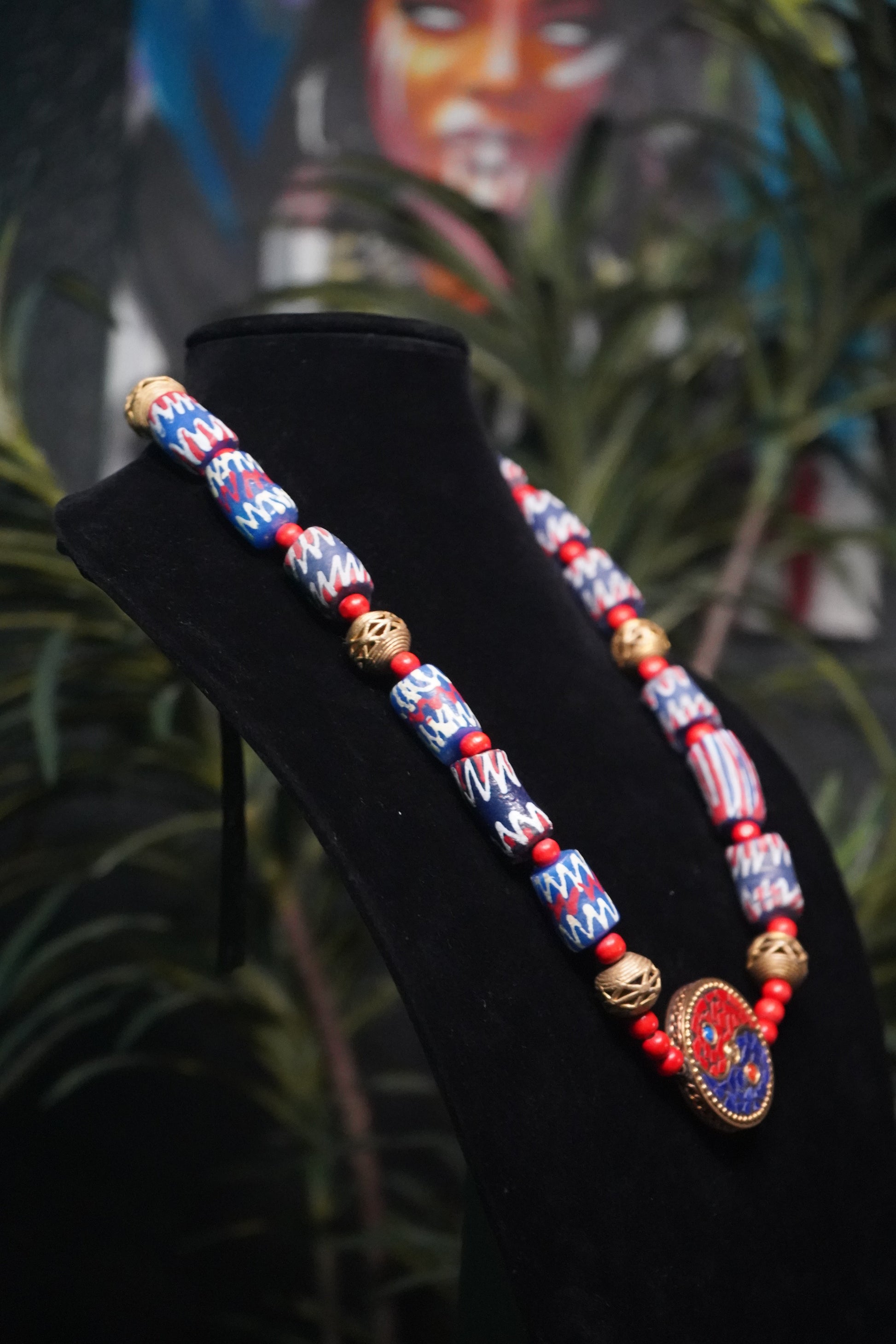 Embrace the essence of Africa with the incorporation of intricate African glass beads, each bead telling a story of tradition and resilience. Complemented by brass and red beads, this necklace exudes a sense of cultural richness and vitality.