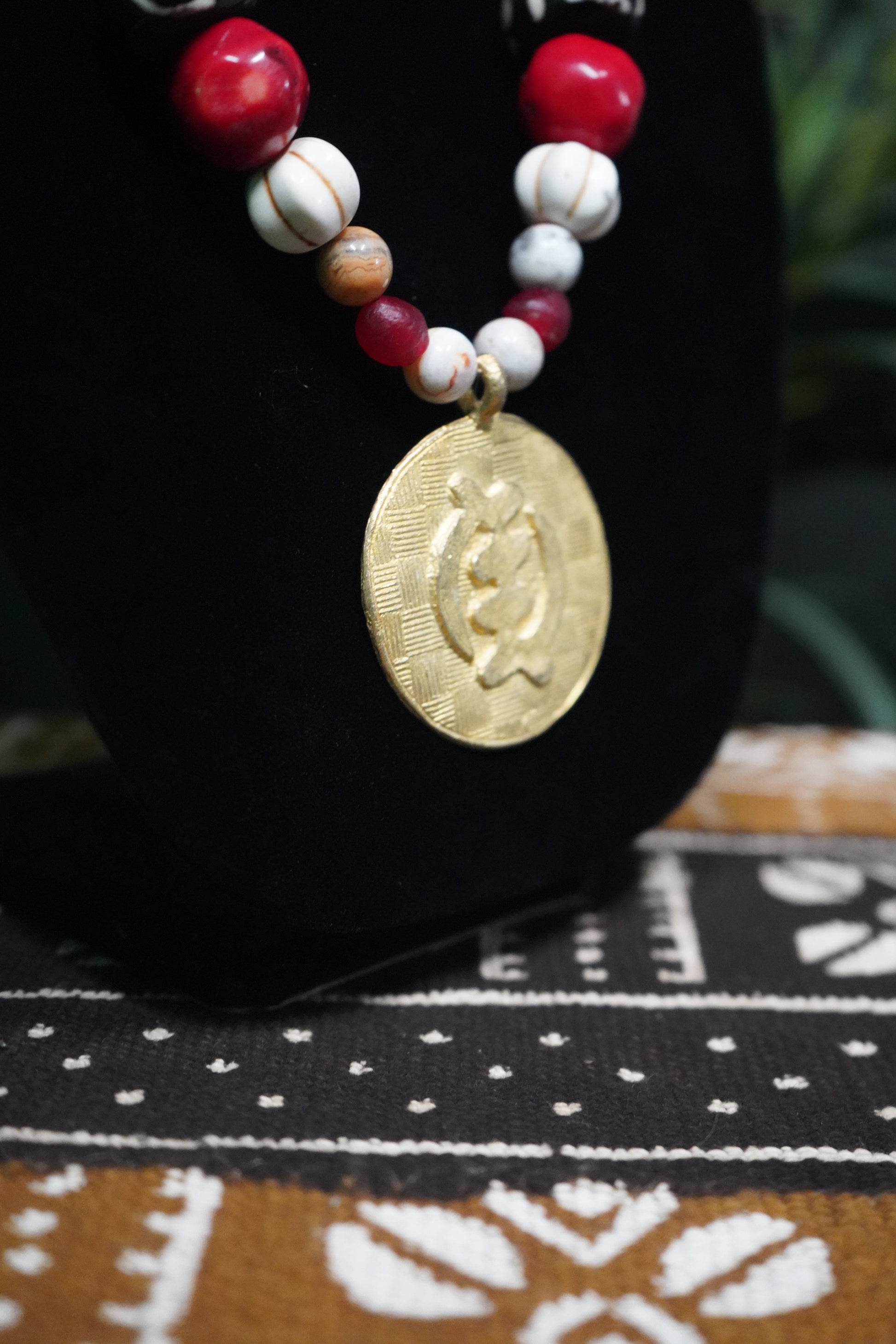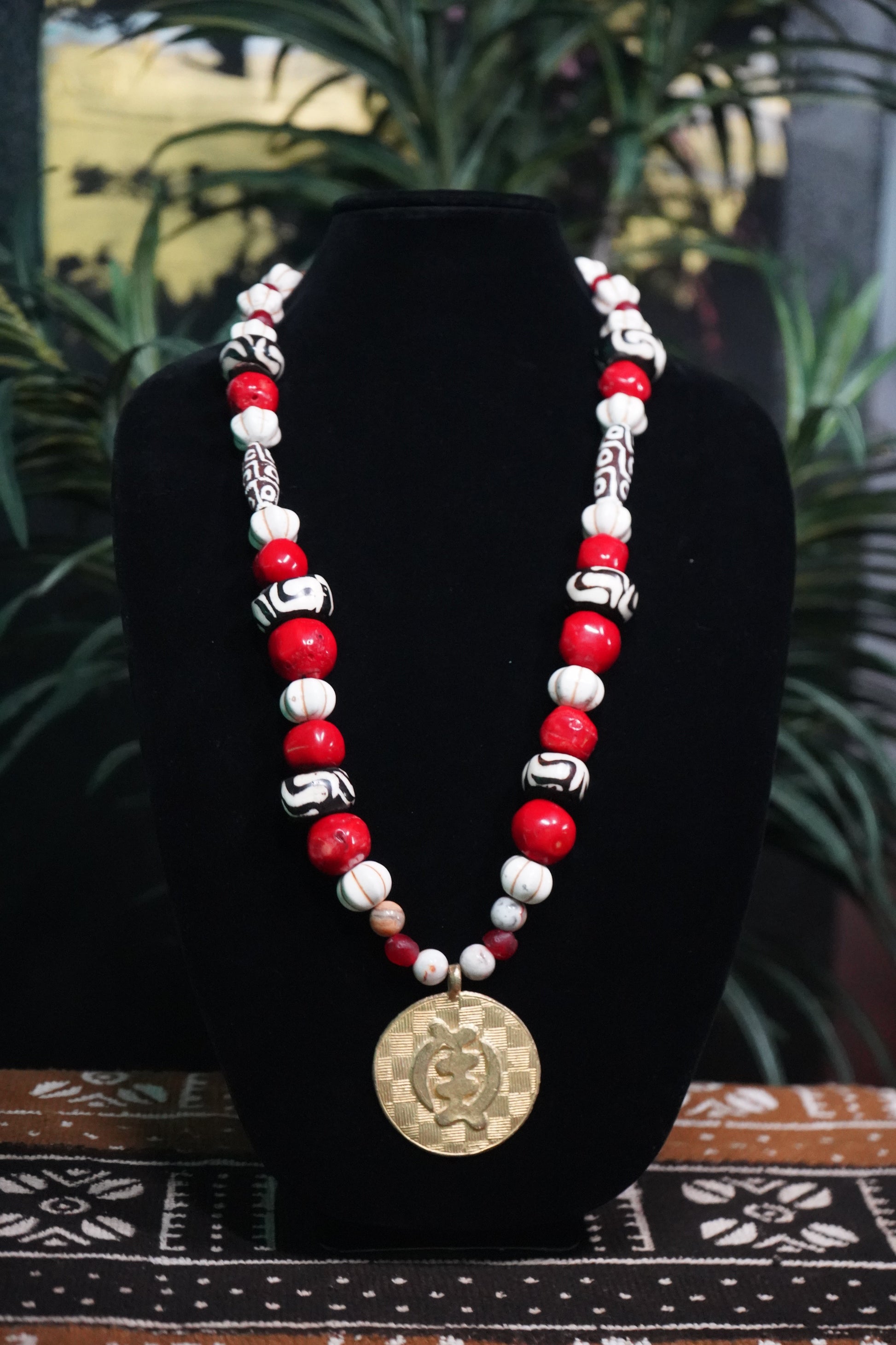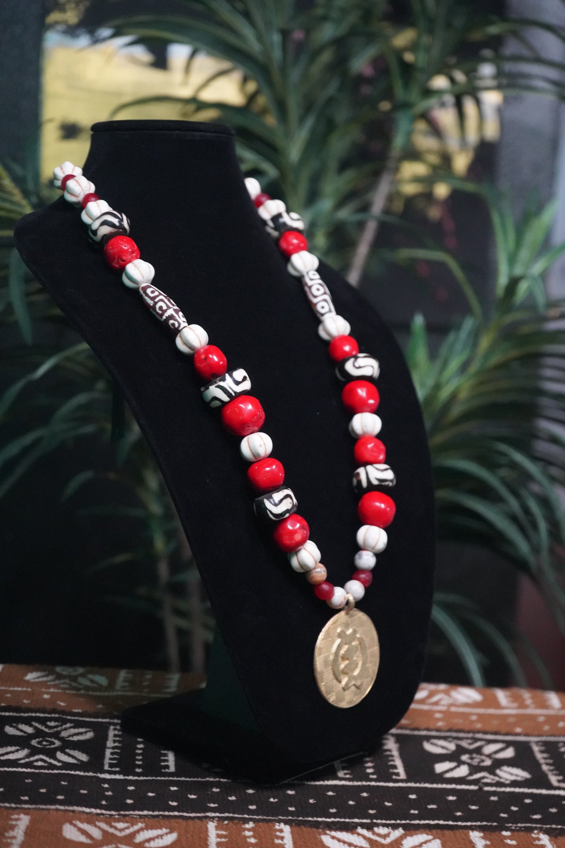 Each element of this necklace is meticulously chosen to reflect the vibrancy and richness of African culture. The deep red stones symbolize passion and determination, while the coral beads evoke the warmth of African landscapes and traditions.